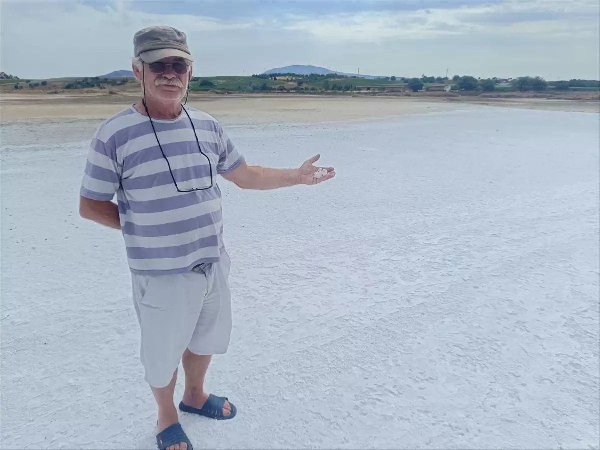 Edirne’nin Enez ilçesinde aşırı sıcaklar nedeniyle suyu buharlaşan Taşaltı Gölü, beyaz ve parlak tabakasıyla vatandaşların ilgisini çekiyor.