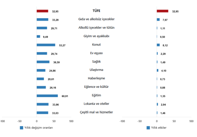 En yüksek ağırlığa sahip 3 ana harcama grubunun yıllık değişimleri; gıda ve alkolsüz içeceklerde %33,28 artış, ulaştırmada %24,86 artış ve konutta %53,27 artış olarak gerçekleşti. İlgili ana grupların yıllık değişime olan etkileri ise gıda ve alkolsüz içeceklerde %7,97, ulaştırmada %4,10 ve konutta %8,12 oldu.