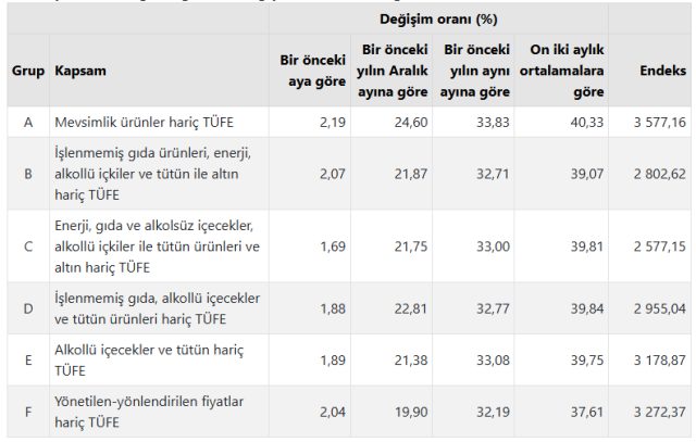 İşlenmemiş gıda ürünleri, enerji, alkollü içkiler ve tütün ile altın hariç TÜFE’deki değişim, 2025 yılı Ağustos ayında bir önceki aya göre %2,07 artış, bir önceki yılın Aralık ayına göre %21,87 artış, bir önceki yılın aynı ayına göre %32,71 artış ve on iki aylık ortalamalara göre %39,07 artış olarak gerçekleşti.
