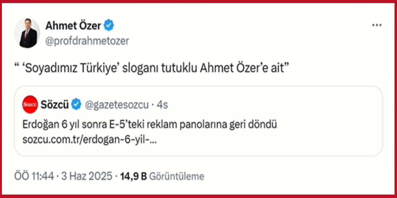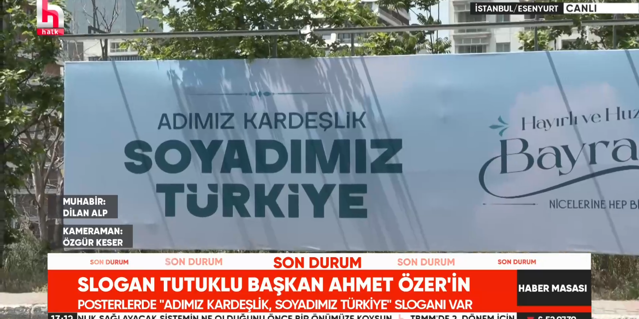 Erdoğan’ın İBB panolarında yer alan “Adımız kardeşlik, soyadımız Türkiye” sloganı, 30 Ekim’de tutuklanan ve yerine kayyum atanan CHP’nin Esenyurt Belediye Başkanı Prof. Dr. Ahmet Özer’e ait çıktı. Ahmet Özer’in ‘Adımız ne olursa olsun, soyadımız Türkiye’ sloganına benzer bir sloganla basılan afişler gündem oldu.