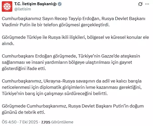 İletişim Başkanlığı’ndan konuya ilişkin yapılan açıklama şu şekilde: “Cumhurbaşkanımız Sayın Recep Tayyip Erdoğan, Rusya Devlet Başkanı Vladimir Putin ile bir telefon görüşmesi gerçekleştirdi.