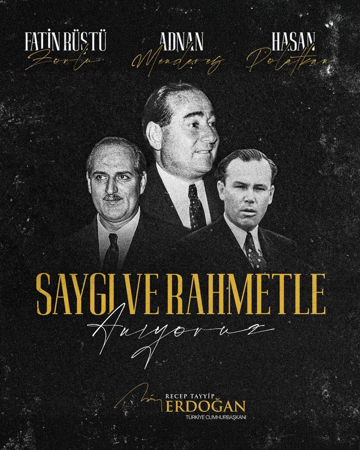 CUMHURBAŞKANI Recep Tayyip Erdoğan, Eski Başbakan Adnan Menderes, Dışişleri Bakanı Fatin Rüştü Zorlu ve Maliye Bakanı Hasan Polatkan’ı idam edilişlerinin 64’üncü yılında andı.