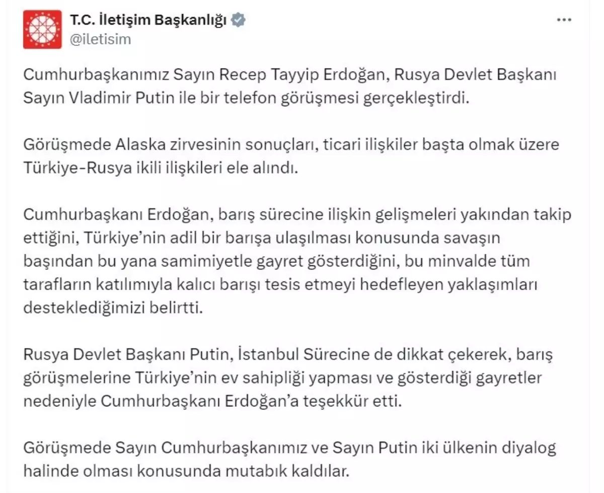 İletişim Başkanlığı’ndan yapılan açıklamaya göre; görüşmede, Alaska zirvesinin sonuçları, ticari ilişkiler başta olmak üzere Türkiye-Rusya ikili ilişkileri ele alındı. Cumhurbaşkanı Erdoğan, barış sürecine ilişkin gelişmeleri yakından takip ettiğini, Türkiye’nin adil bir barışa ulaşılması konusunda savaşın başından bu yana samimiyetle gayret gösterdiğini, bu minvalde tüm tarafların katılımıyla kalıcı barışı tesis etmeyi hedefleyen yaklaşımları desteklediklerini belirtti. Rusya Devlet Başkanı Putin, İstanbul sürecine de dikkat çekerek, barış görüşmelerine Türkiye’nin ev sahipliği yapması ve gösterdiği gayretler nedeniyle Cumhurbaşkanı Erdoğan’a teşekkür etti. Görüşmede Erdoğan ve Putin, iki ülkenin diyalog halinde olması konusunda mutabık kaldı.