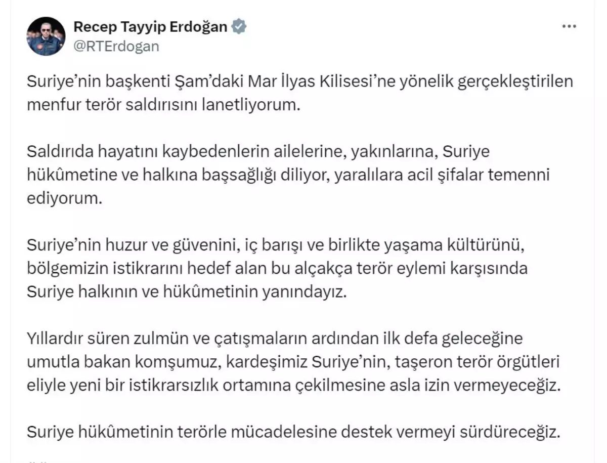 CUMHURBAŞKANI Recep Tayyip Erdoğan, Suriye'deki kiliseye yönelik terör saldırısıyla ilgili, "Suriye'nin huzur ve güvenini, iç barışı ve birlikte yaşama kültürünü, bölgemizin istikrarını hedef alan bu alçakça terör eylemi karşısında Suriye halkının ve hükümetinin yanındayız.
