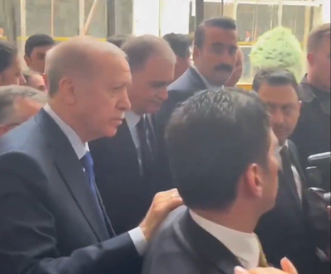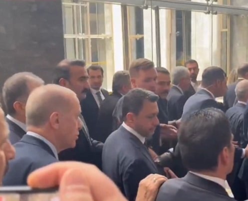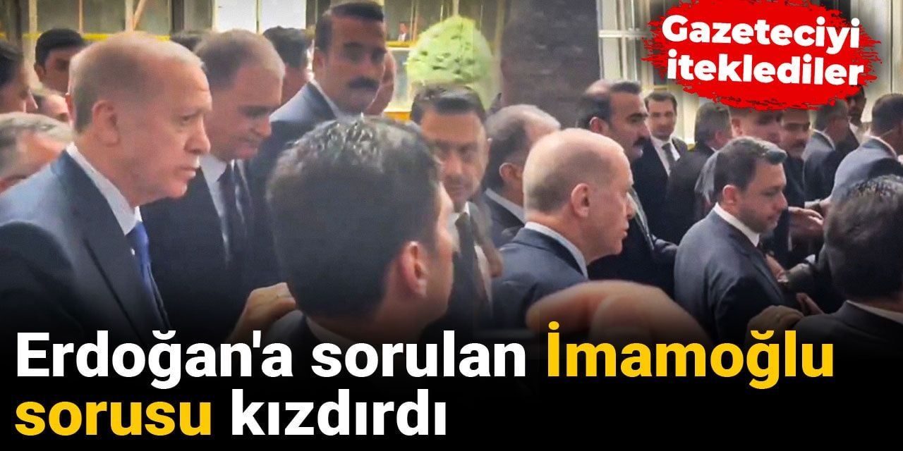 Bir kadın gazeteci Erdoğan’a İmamoğlu ile alakalı soru sormaya çalıştı. Kadın gazeteci, “İmamoğlu’nun davaları…” diyerek soru sorarken Erdoğan’ın korumaları tarafından itildi. O anlar kameralara yansıdı. Erdoğan’ın soruya yanıt vermeden korumasının omzundan tutarak gittiği kameralara yansıdı.