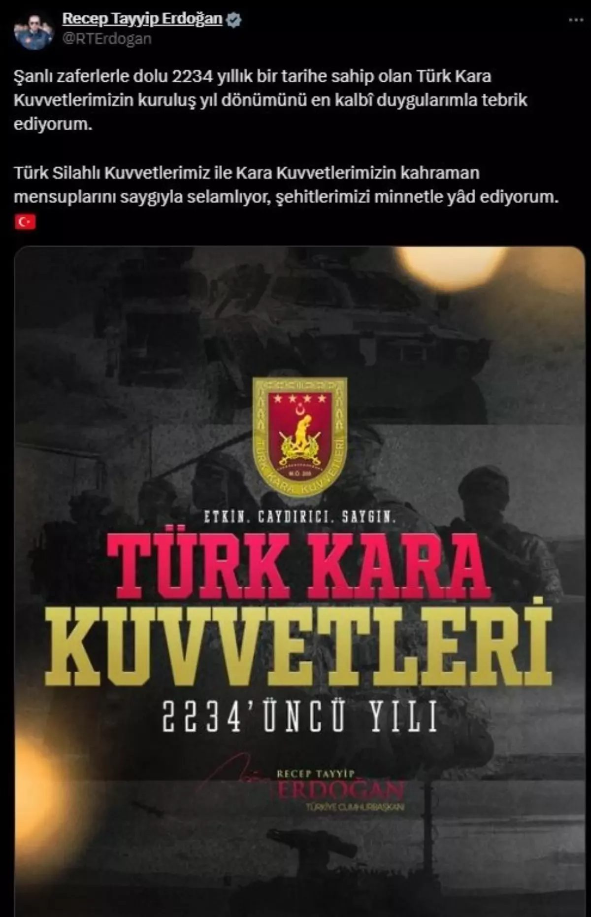 CUMHURBAŞKANI Erdoğan Türk Kara Kuvvetleri’nin kuruluş yıl dönümünü kutladı.