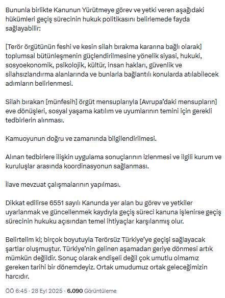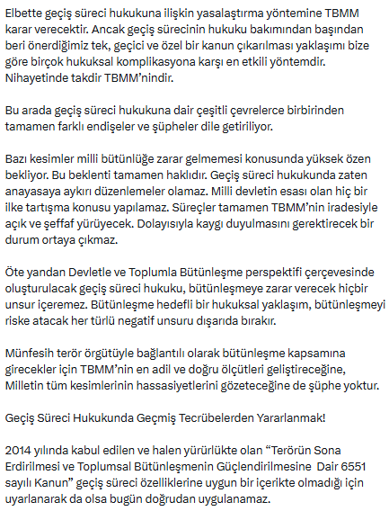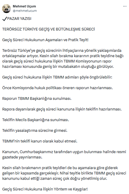 2014 yılında kabul edilen ve hala geçerli olan “Terörün Sona Erdirilmesi ve Toplumsal Bütünleşmenin Güçlendirilmesine Dair 6551 sayılı Kanun” kanununu hatırlatan Uçum, bu kanunun geçiş sürecine uygun olmadığı için bugün doğrudan uygulanamayacağını, bu süreçten geriye dönmenin artık mümkün olmadığını ifade etti. Uçum’un yazısı şu şekilde:
