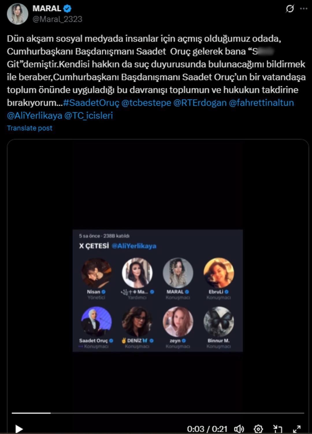 Sosyal medyada yayılan bir video adeta bomba etkisi yarattı. Bir sohbet odasındaki tartışmaya katılan Cumhurbaşkanı Başdanışmanı Saadet Oruç’un bir kadın ile tartışmasının ardından kendisine, ‘s…git’ dediği anların ekran kaydı ortaya çıktı. “Maral_2323” kullanıcı adlı kadın vatandaş bu anların kaydını alarak sosyal medyada paylaştı.