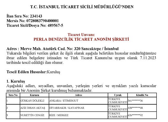 Esas büyük işlerden birisi ise 7 Kasım 2023’te kurulan Perla Denizcilik. Bu şirkette Aktaş ile ortak olan iki isim var.