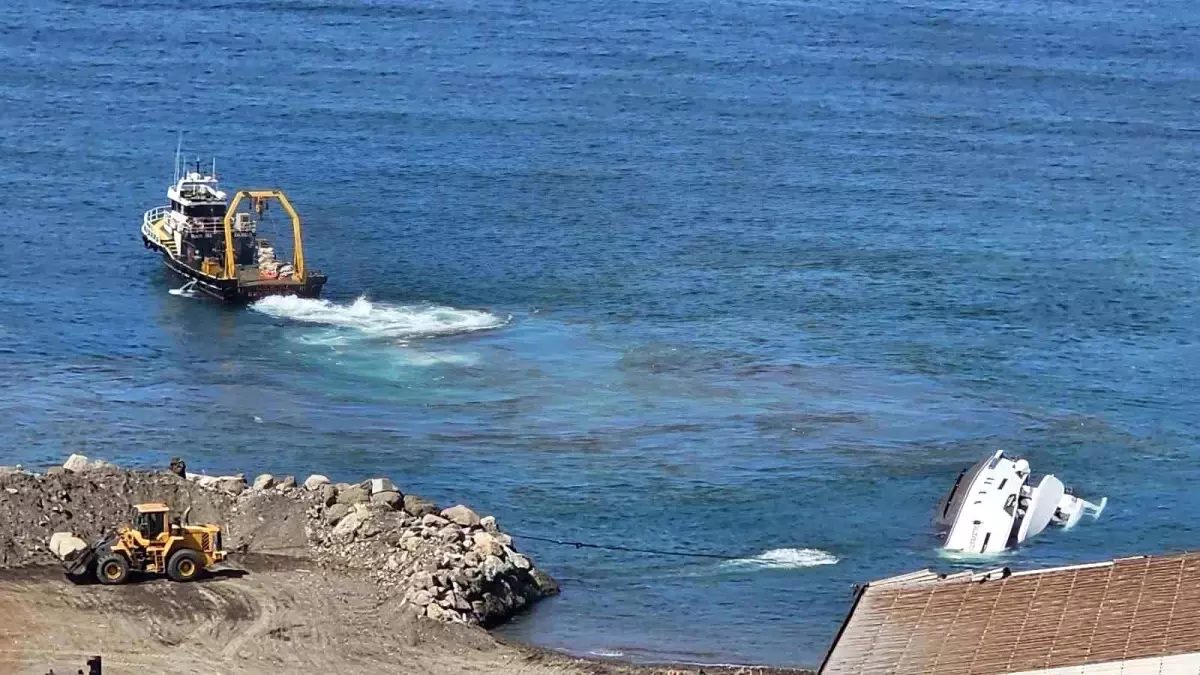 Halatlar yardımıyla sudan çıkartılan yat, yaklaşık 200 metre mesafeden tersanenin önüne taşındı. İş makineleri ve teknelerle müdahale edilerek yatı karaya çıkartma çalışmaları sürüyor.