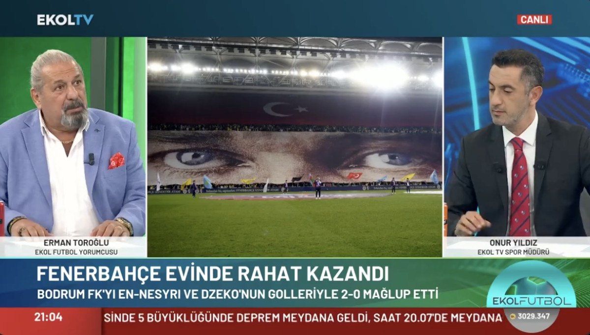 Ekol TV yayınında Fenerbahçe-Bodrumspor maçını yorumlayan sunucu Onur Yıldız ile birlikte Toroğlu, Atatürk’ün Türkiye için kendisini feda ettiğini söyledi.