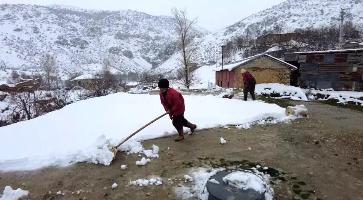 Kış çilesinin yüzünü gösterdiği Kalecik köyünde toprak damlı ev ve ahırların bacalarını kardan küremek kadınlara düştü. Sabah saatlerinde tahta kızaklarla damların bacalarını kardan küreyen kadınlar, kışın köylerde hayat şartlarının oldukça zor olduğunu söylediler.