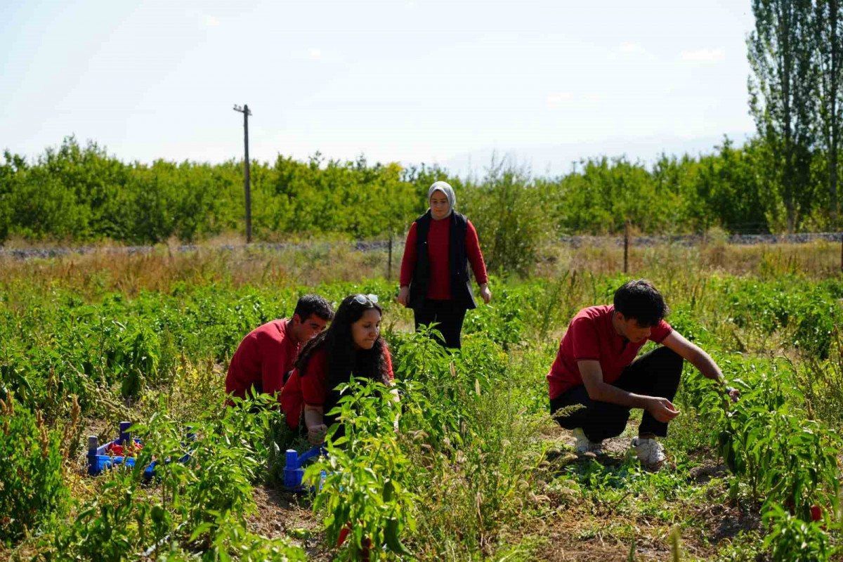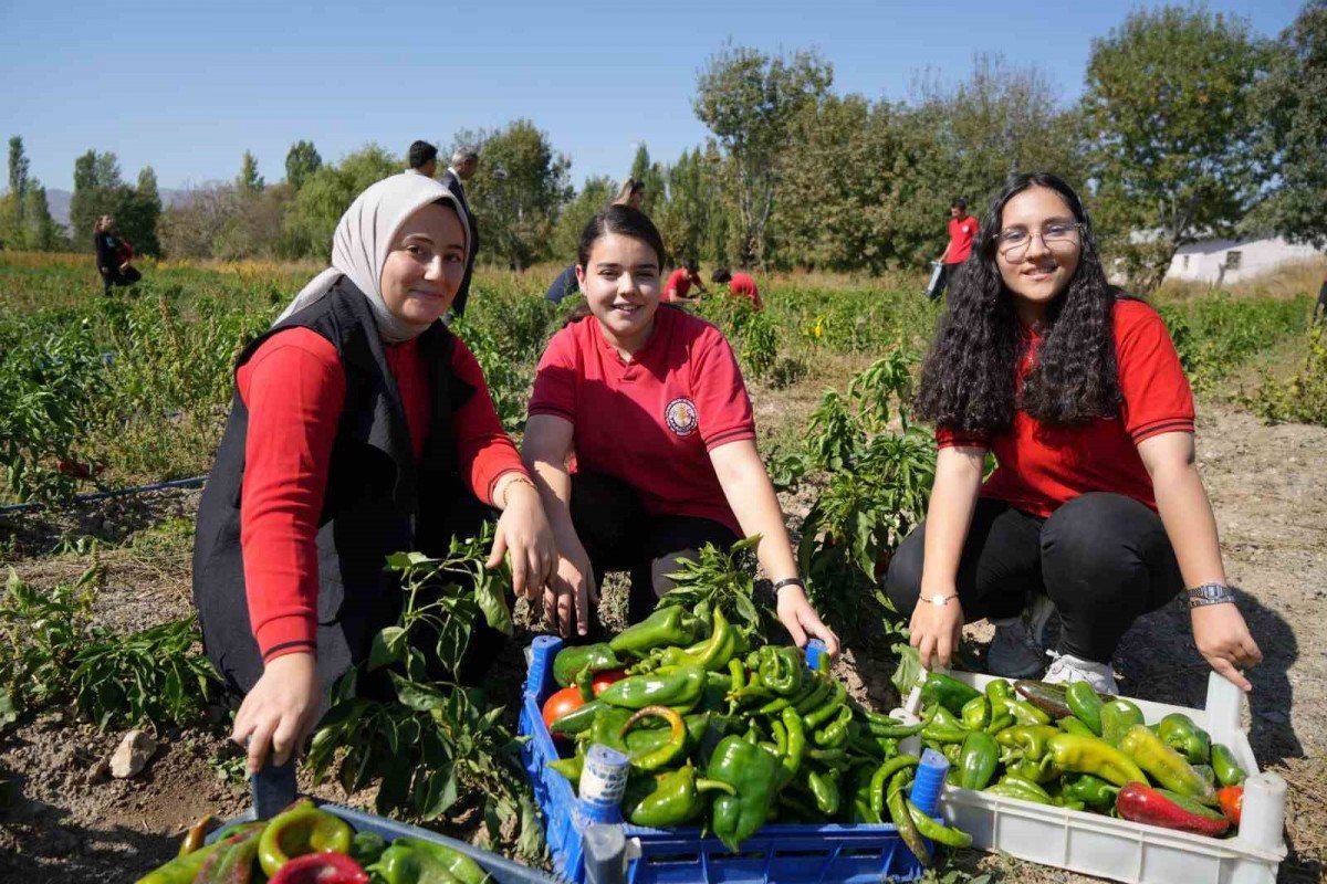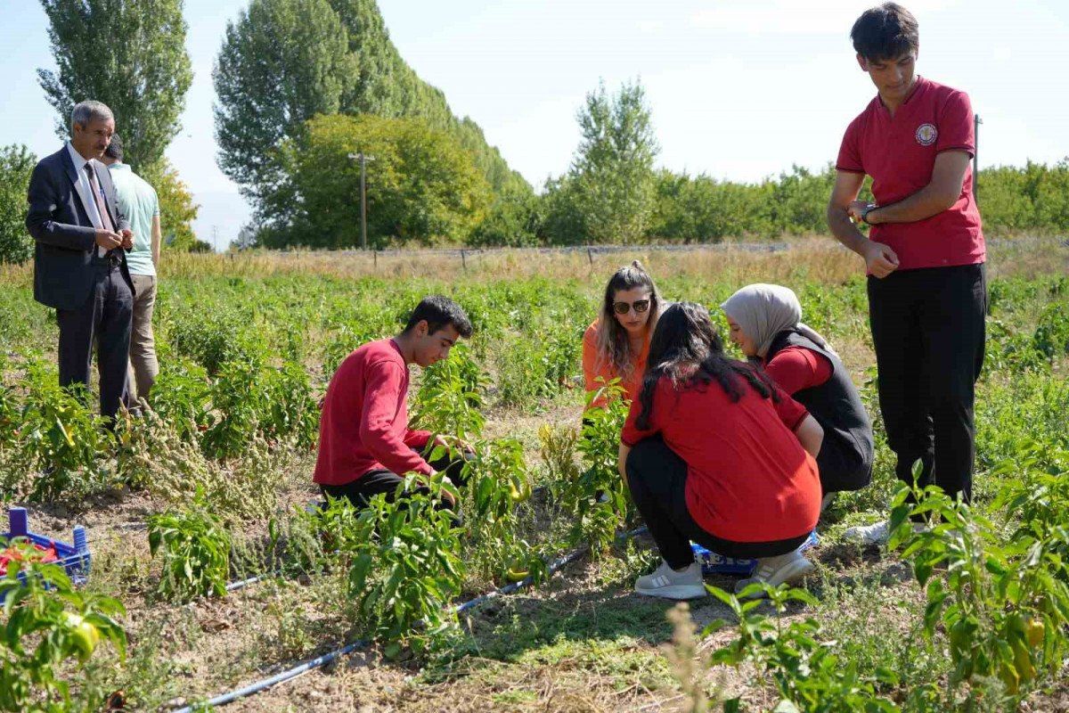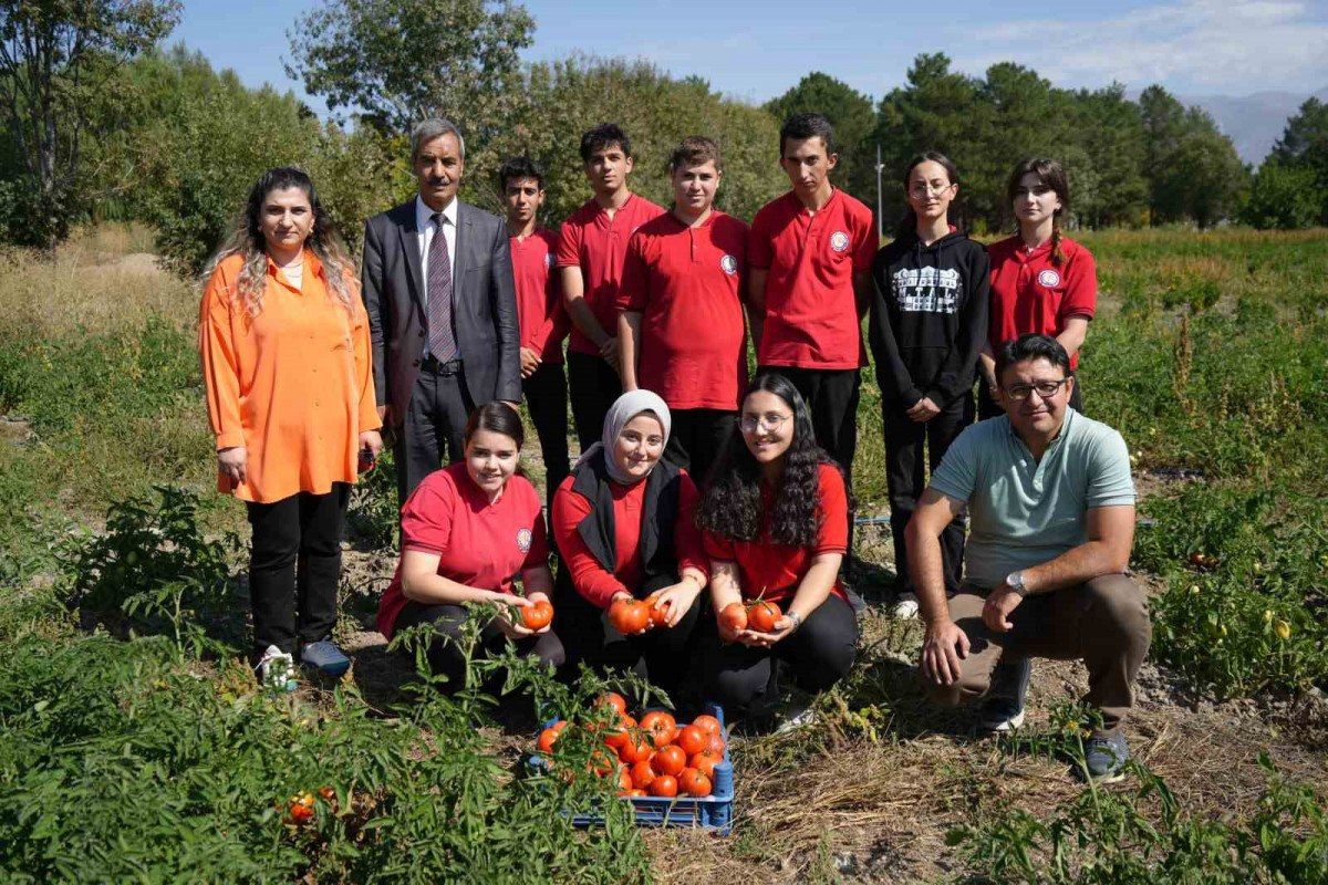Erzincan’da Gül Celal Toraman Mesleki ve Teknik Anadolu Lisesi öğrencileri, okul bahçesinde oluşturulan yaklaşık 5 dönüm tarlada domates, biber yetiştiriyor.