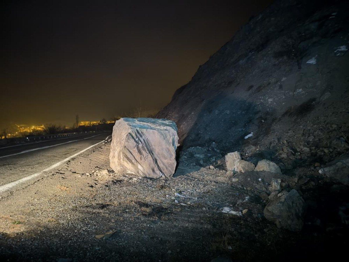 Heyelan sırasında devasa bir kaya kütlesi karayoluna düştü ve yolun ulaşıma kapanmasına neden oldu.