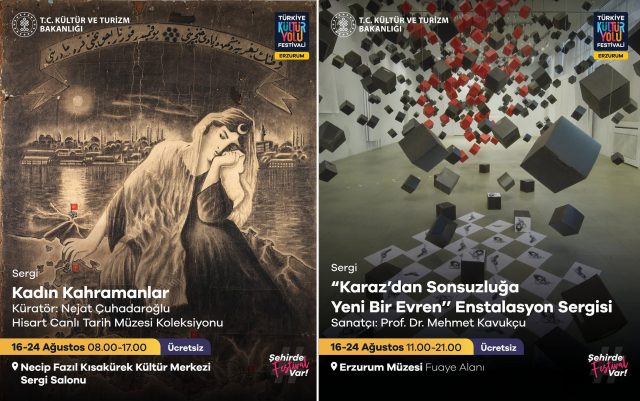 Festival boyunca, Erzurum’un tarihi dokusuyla iç içe geçmiş özel mekanlarda, sanatseverlere kapılarını açan sürekli sergiler, şehrin kültürel zenginliğini tüm ihtişamıyla gözler önüne serecek. Yakutiye Medresesi Türk İslam Eserleri ve Etnografya Müzesi’nde “Gökler, Göçler ve Kökler” temasıyla derin bir yolculuğa çıkılırken; Necip Fazıl Kısakürek Kültür Merkezi Sergi Salonu’nda, ilham veren “Kadın Kahramanlar” ile Anadolu’nun sırlarını taşıyan “Gizem Dolu Anadolu” sergileri her gün sabahın erken saatlerinden itibaren kapılarını açacak. Gün boyunca, Kale önünde gerçekleşen “Gökyüzünden Türkiye” sergisi ise ülkenin eşsiz doğal güzelliklerini ve kültürel çeşitliliğini benzersiz bir bakışla görsel şölen olarak sunacak.