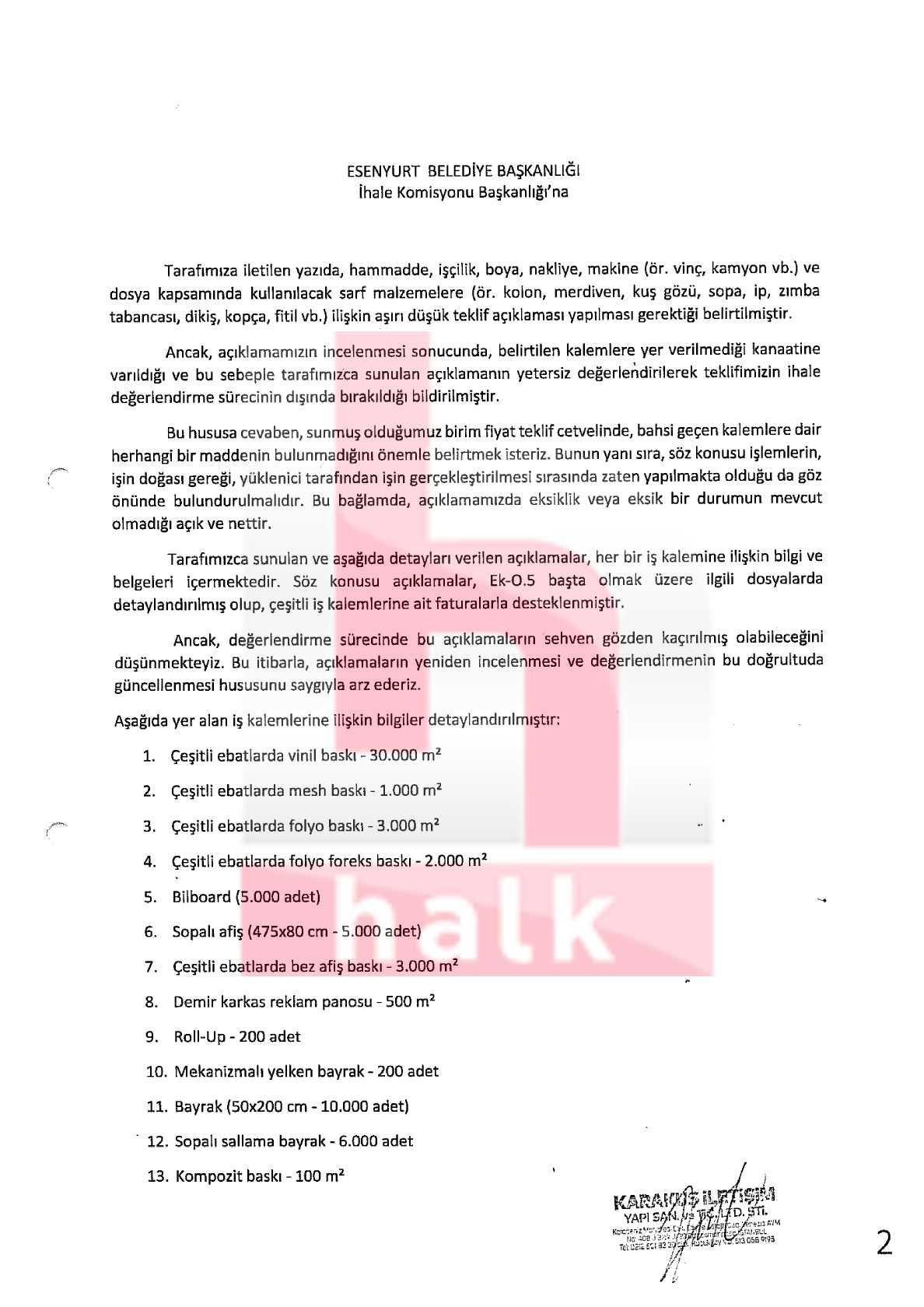 Şirket bunun üzerine belediyeye bir dilekçe yazdı. Dilekçede, “Tarafımıza iletilen yazıda, hammadde, işçilik, boya, nakliye, makine (ör. vinç, kamyon vb.) ve dosya kapsamında kullanılacak sarf malzemelere (ör. kolon, merdiven, kuş gözü, sopa, ip, zımba tabancası, dikiş, kopça, fitil vb.) ilişkin aşırı düşük teklif açıklaması yapılması gerektiği belirtilmiştir. Ancak, açıklamamızın incelenmesi sonucunda, belirtilen kalemlere yer verilmediği kanaatine varıldığı ve bu sebeple tarafımızca sunulan açıklamanın yetersiz değerlendirilerek teklifimizin ihale değerlendirme sürecinin dışında bırakıldığı bildirilmiştir. Bu hususa cevaben, sunmuş olduğumuz birim fiyat teklif cetvelinde, bahsi geçen kalemlere dair herhangi bir maddenin bulunmadığını önemle belirtmek isteriz. Bunun yanı sıra, söz konusu işlemlerin, işin doğası gereği, yüklenici tarafından işin gerçekleştirilmesi sırasında zaten yapılmakta olduğu da göz önünde bulundurulmalıdır. Bu bağlamda, açıklamamızda eksiklik veya eksik bir durumun mevcut olmadığı açık ve nettir. Tarafımızca sunulan ve aşağıda detayları verilen açıklamalar, her bir iş kalemine ilişkin bilgi ve belgeleri içermektedir. Söz konusu açıklamalar, Ek-0.5 başta olmak üzere ilgili dosyalarda detaylandırılmış olup, çeşitli iş kalemlerine ait faturalarla desteklenmiştir. Ancak, değerlendirme sürecinde bu açıklamaların sehven gözden kaçırılmış olabileceğini düşünmekteyiz. Bu itibarla, açıklamaların yeniden incelenmesi ve değerlendirmenin bu doğrultuda güncellenmesi hususunu saygıyla arz ederiz” ifadelerine yer verildi. Ayrıca şirket diğer ihalelerinin faturalarını da dilekçeye ekledi.