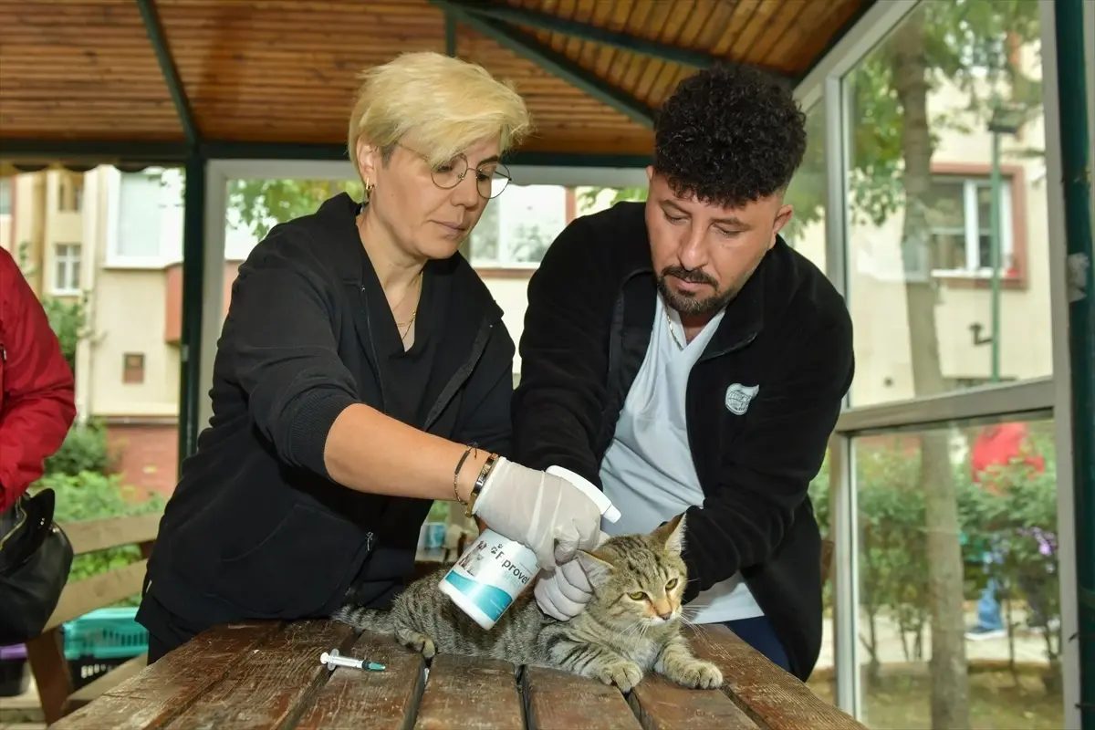 Veteriner hekimler tarafından kedilere parazit uygulamaları yapılarak genel sağlıkları da kontrol edildi. Kontrollerde, kedilerin beslenme durumları ve olası hastalık belirtileri incelendi.