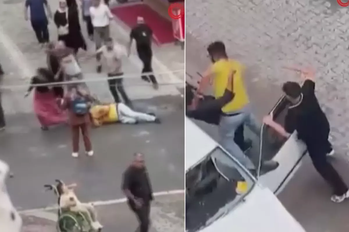 Taraflar birbirilerine sopa, taş ve yumruklarla saldırırken, ortalık savaş alanına döndü. Bir şahıs ise kavga ettiği adamların üzerine aracını sürerken, ön camının atılan bir taş üzerine kırılması sonucunda park halindeki arabaya çarptı. Yaşanan o anlar ise anbean kameraya yansıdı.