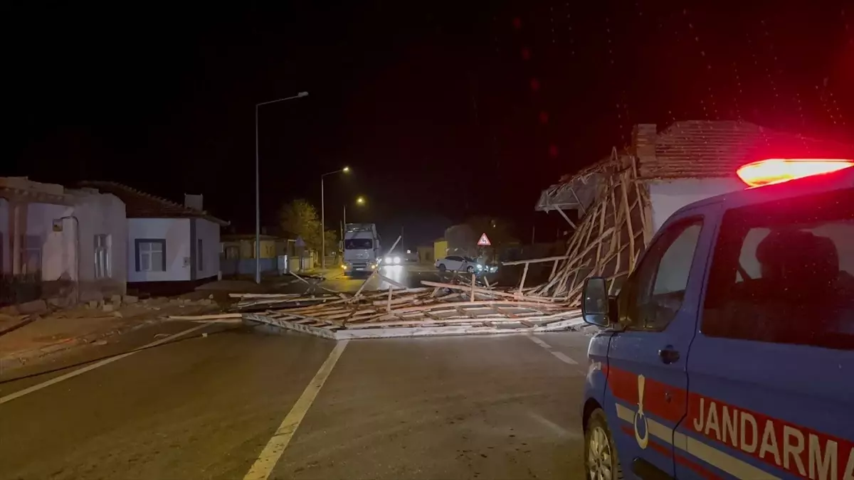 Aksaray'ın Eskil ilçesinde fırtına nedeniyle bir evin çatı yolu kapattı, yol 2 saat sonra açıldı.