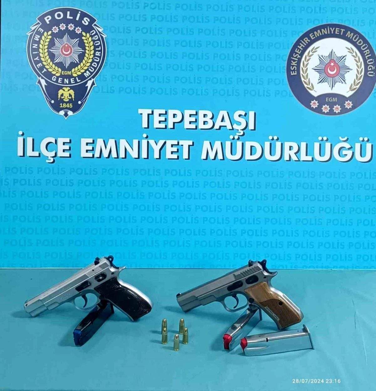 Tepebaşı ilçesi Muttalip Mahallesi’nde gerçekleşen bir düğünde, havaya silahla ateş edilmesi polis ekiplerine ihbar edildi. Tepebaşı İlçe Emniyet Müdürlüğü ekiplerince çalışma başlatılarak, konuyla ilgili düğün yakınında bulunan 2 şüpheli yakalandı. Yakalanan şüphelilerden toplamada; 2 tabanca, 3 şarjör ve 5 fişek ele geçirildi. Yakalanan 2 şüpheli hakkında işlemler yapıldı. – ESKİŞEHİR