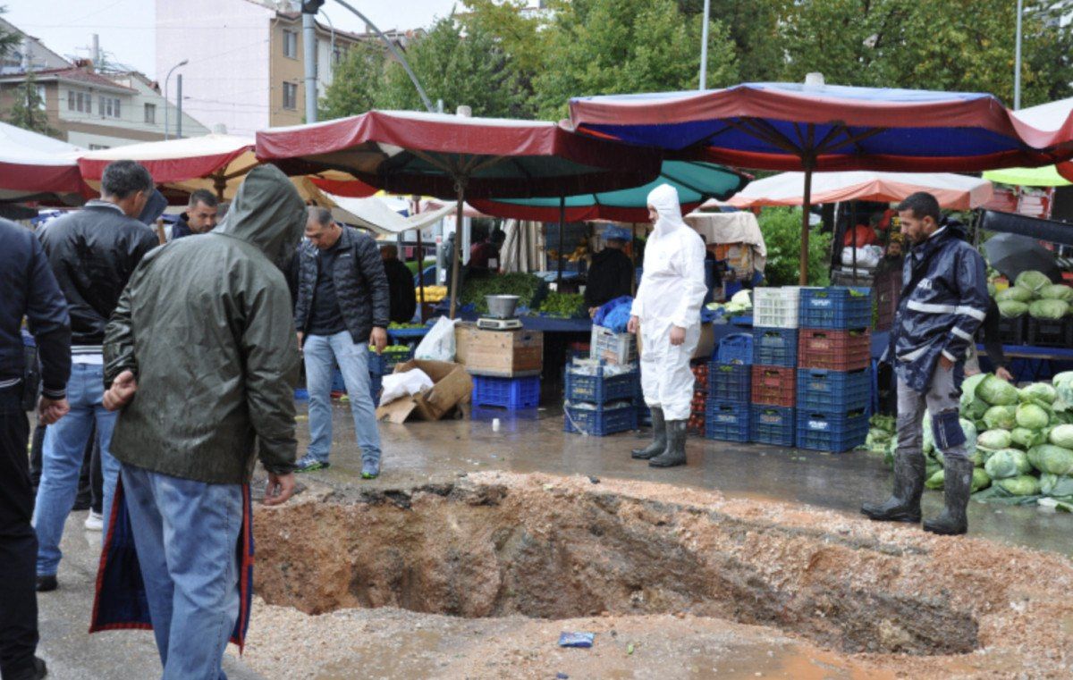 Eskişehir’de Odunpazarı ilçesi Yıldıztepe Mahallesi’nde semt pazarının kurulduğu Millet Caddesi’nde sağanak nedeniyle çökme meydana geldi.