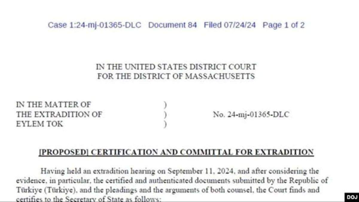 Massachusetts Bölge Başsavcı Yardımcısı Kristen A. Kearney, Eylem Tok’un 11 Eylül’de Boston’da yapılacak Türkiye’ye iadesiyle ilgili duruşması öncesinde, ABD Dışişleri Bakanlığı’nın iadeyi onaylaması için hazırladığı taslak karar metnini Hakim Donald Cabell’e sundu.