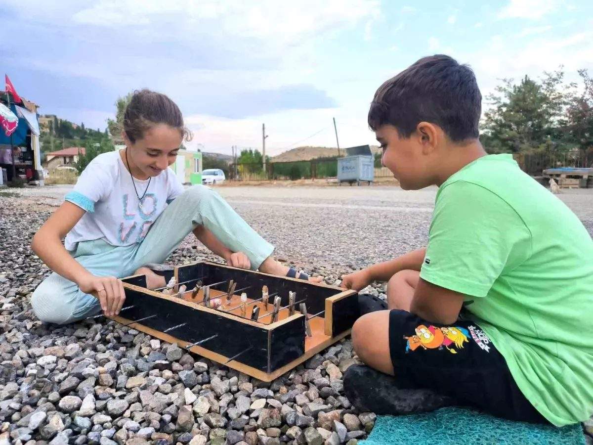 6 Şubat depremlerinde büyük yıkım yaşayan Doğanşehir ilçesinde ailesiyle birlikte yaşayan Atatürk Ortaokulu 6. sınıf öğrencisi Eylül Demirci, kendi imkanlarıyla çamaşır mandalı ve şişten langırt yaparak yaz tatilinde kardeşleriyle keyifli vakit geçirdi.