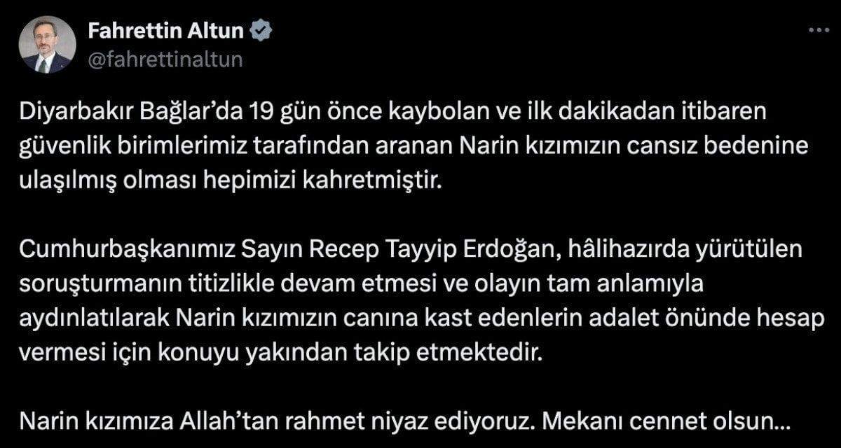 Cumhurbaşkanımız Sayın Recep Tayyip Erdoğan, hâlihazırda yürütülen soruşturmanın titizlikle devam etmesi ve olayın tam anlamıyla aydınlatılarak Narin kızımızın canına kast edenlerin adalet önünde hesap vermesi için konuyu yakından takip etmektedir.