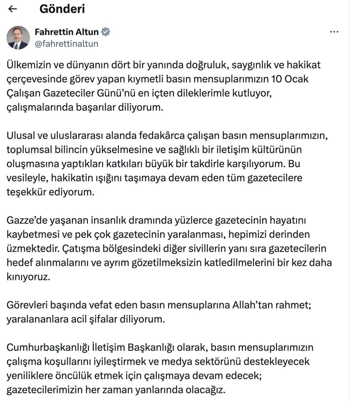 Cumhurbaşkanlığı İletişim Başkanı Fahrettin Altun, 10 Ocak Çalışan Gazeteciler Günü dolayısıyla sosyal medya hesabından açıklama yaptı.