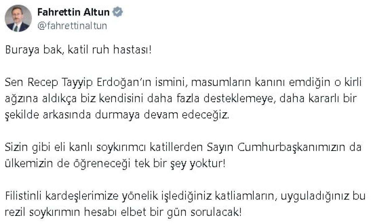 Katil ruh hastası! Sen Recep Tayyip Erdoğan’ın ismini, masumların kanını emdiğin o kirli ağzına aldıkça biz kendisini daha fazla desteklemeye, daha kararlı bir şekilde arkasında durmaya devam edeceğiz. Sizin gibi eli kanlı soykırımcı katillerden Sayın Cumhurbaşkanımızın da ülkemizin de öğreneceği tek bir şey yoktur.