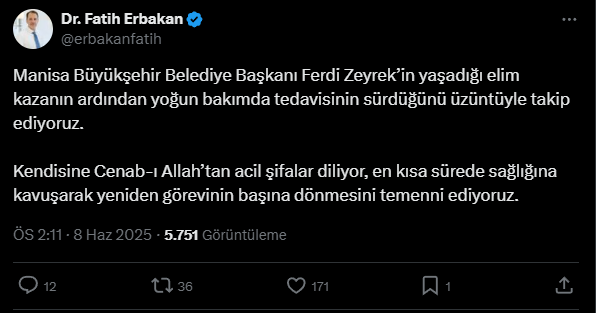 “Manisa Büyükşehir Belediye Başkanı Ferdi Zeyrek’in yaşadığı elim kazanın ardından yoğun bakımda tedavisinin sürdüğünü üzüntüyle takip ediyoruz. Kendisine Cenab-ı Allah’tan acil şifalar diliyor, en kısa sürede sağlığına kavuşarak yeniden görevinin başına dönmesini temenni ediyoruz.”