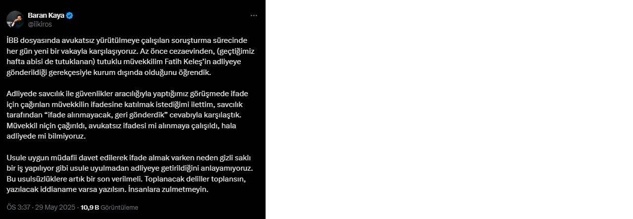 “İBB dosyasında avukatsız yürütülmeye çalışılan soruşturma sürecinde her gün yeni bir vakayla karşılaşıyoruz. Az önce cezaevinden, (geçtiğimiz hafta abisi de tutuklanan) tutuklu müvekkilim Fatih Keleş’in adliyeye gönderildiği gerekçesiyle kurum dışında olduğunu öğrendik.
