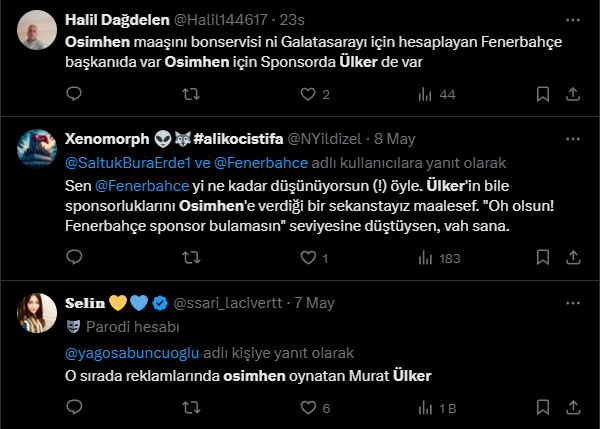 Ancak Osimhen’in reklam yüzü olması ve Ülker CEO’sunun sözleri Fenerbahçe camiasında rahatsızlık yarattı. Fenerbahçe taraftarı olmasıyla bilinen Murat Ülker’in sahiplerinden olduğu bir firmada Galatasaraylı bir futbolcunun reklam yüzü olması tepki çekti. Sosyal medya hesaplarından paylaşım yapan Fenerbahçeli taraftarlar Murat Ülker’e tepki gösterdi.
