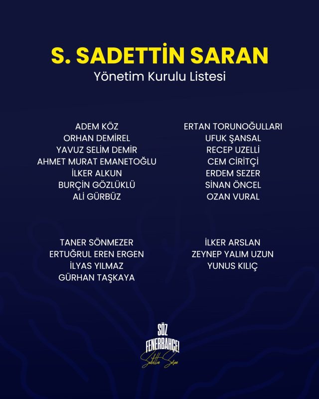 Süper Lig devi Fenerbahçe’de eylül ayında gerçekleşecek olan seçimli olağanüstü genel kurulu öncesi başkan adayı Sadettin Saran’ın yönetim kurulu listesi belli oldu.