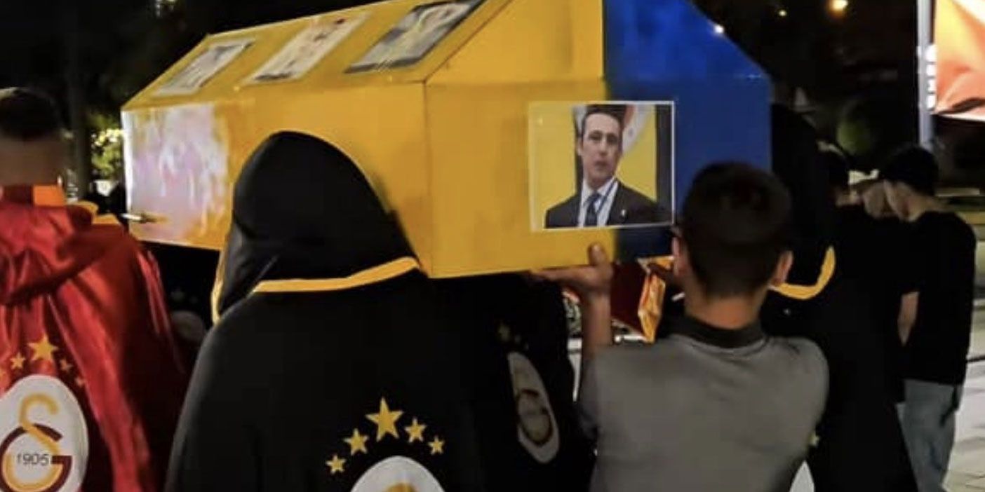 Pelerin giyen bir grup taraftar da Fenerbahçe renklerinin boyalı olduğu tabutu ellerinde taşıdı.