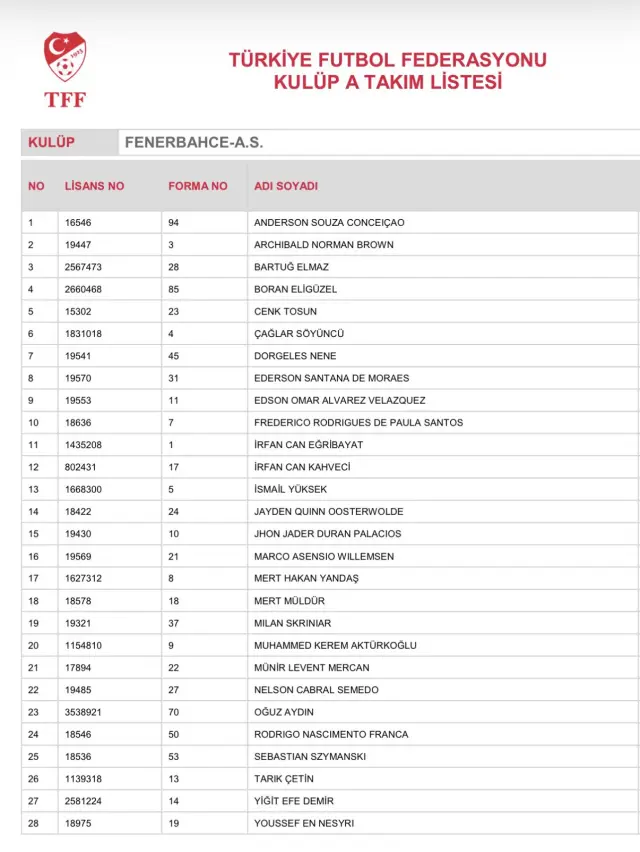 İşte Fenerbahçe’nin TFF’ye bildirdiği listenin tamamı;