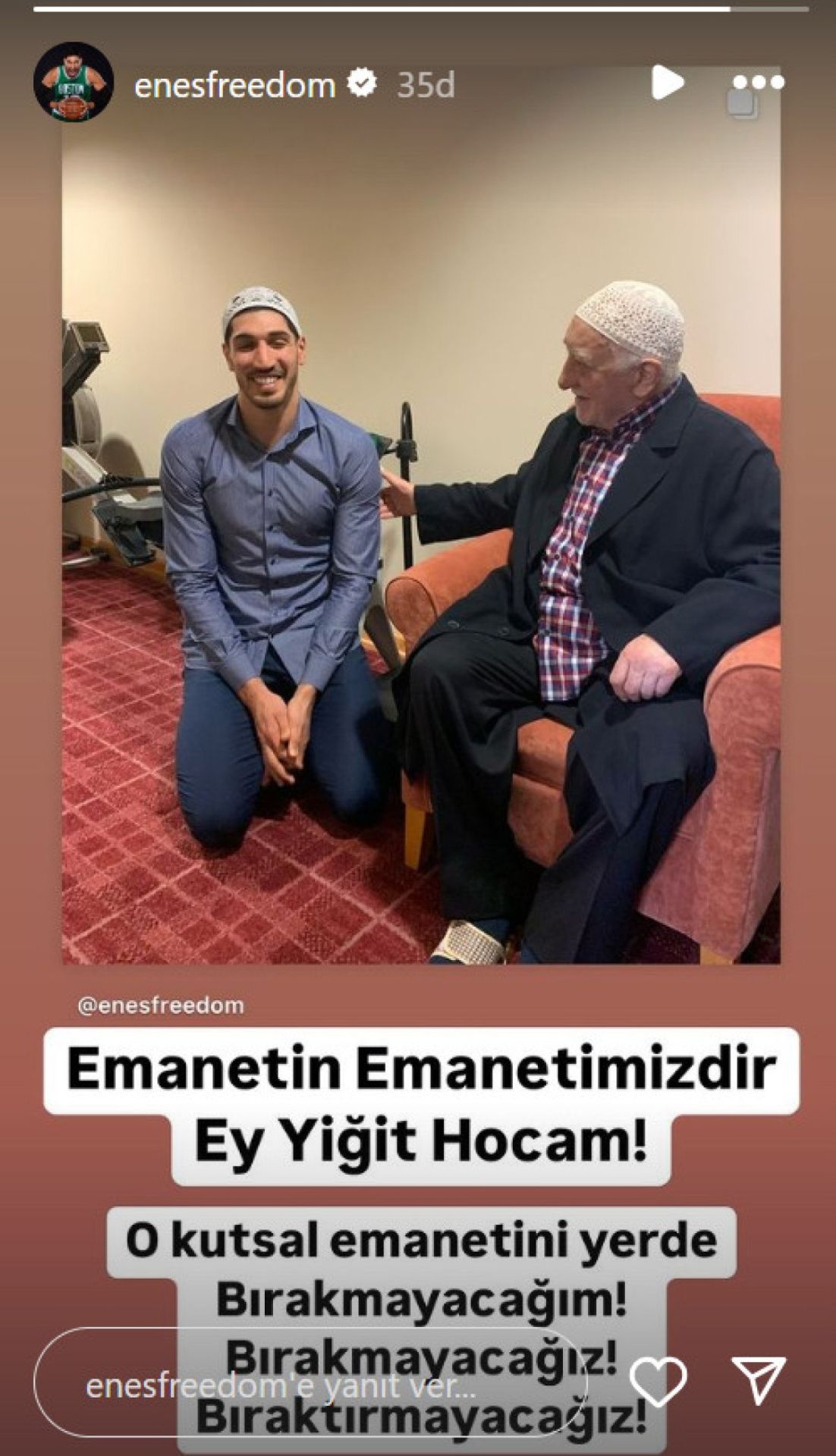 Fotoğrafların altına “Emanetin emanetimizdir ey yiğit Hocam” notunu düşen Kanter, Gülen’i bir de rüyasında gördüğünü söyledi.