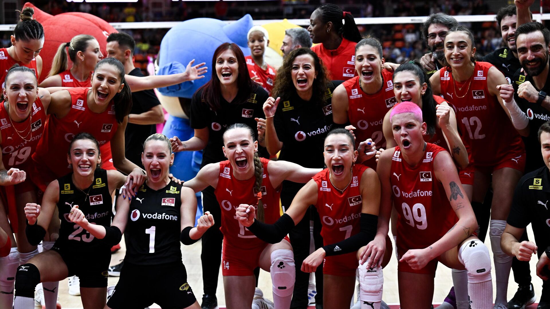 A Milli Kadın Voleybol Takımı, FIVB Kadınlar Dünya Voleybol Şampiyonası’nın finalinde İtalya ile Tayland’ın Bangkok kentindeki Huamark Kapalı Spor Salonu’nda karşılaştı. Karşılaşma öncesinde Gençlik ve Spor Bakanı Osman Aşkın Bak (sağda), taraftarları selamladı.