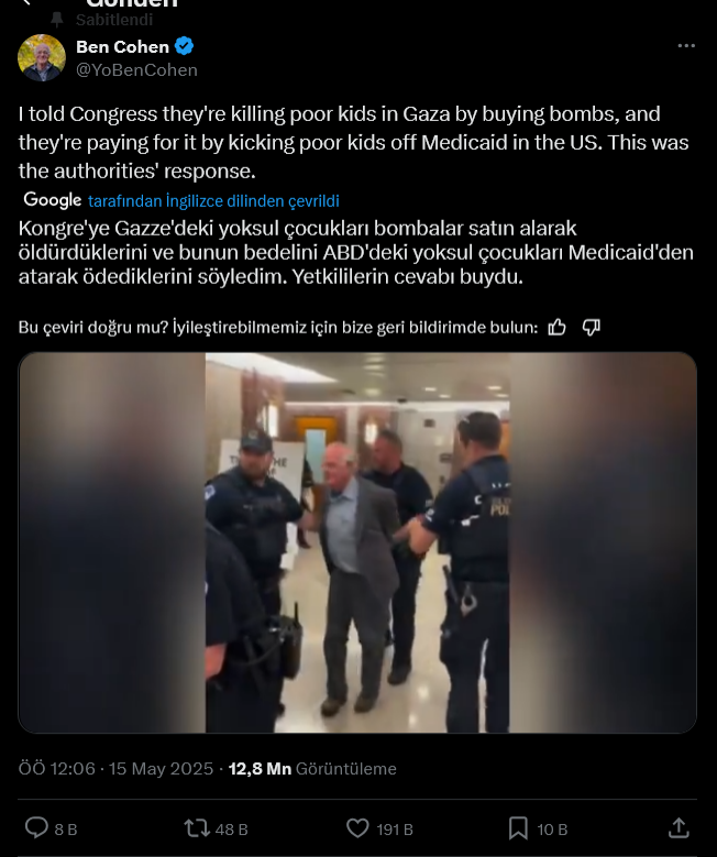 ABD’nin sembol markalarından ve dünya çapında büyük bir kültürel etkisi olan dondurma markası Ben & Jerry’s’in Ben Cohen, ABD Senatosu’nda İsrail’e askeri yardım ve Gazze’deki insani koşullara karşı düzenlenen protesto sırasında gözaltına alındı.
