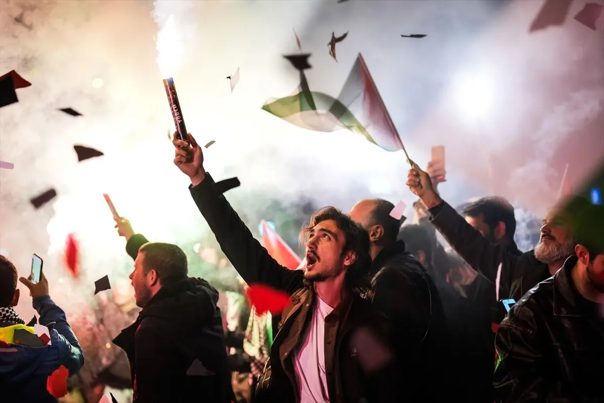 İsrail aleyhine slogan atan gruptakiler, ” Hamas’a selam, direnişe devam” yazılı döviz taşıdı.
