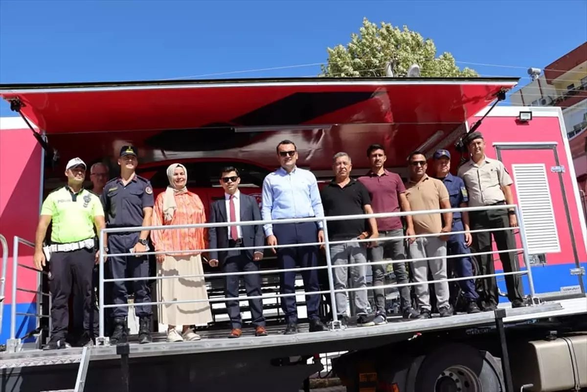Kaymakam Musa Kazım Çelik, Başsavcısı Vahdet Gebeş, İlçe Jandarma Komutanı Jandarma Üsteğmen Murat Kemal Karayaka ile protokol üyeleri, simülasyon tırındaki eğitimi izledi.