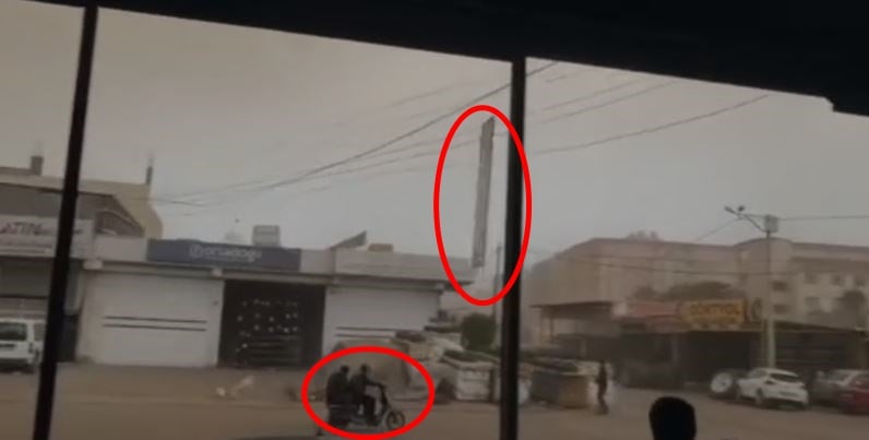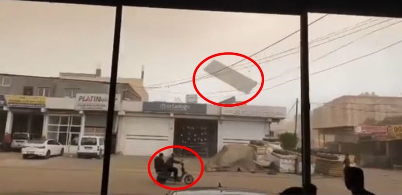 Bir iş yerinin çatısında bulunan çatı malzemeleri de kuvvetli rüzgarla birlikte savruldu. Bir sac levha, sokaktan geçen ve üzerinde 2 kişi bulunan motosiklete doğru yöneldi.