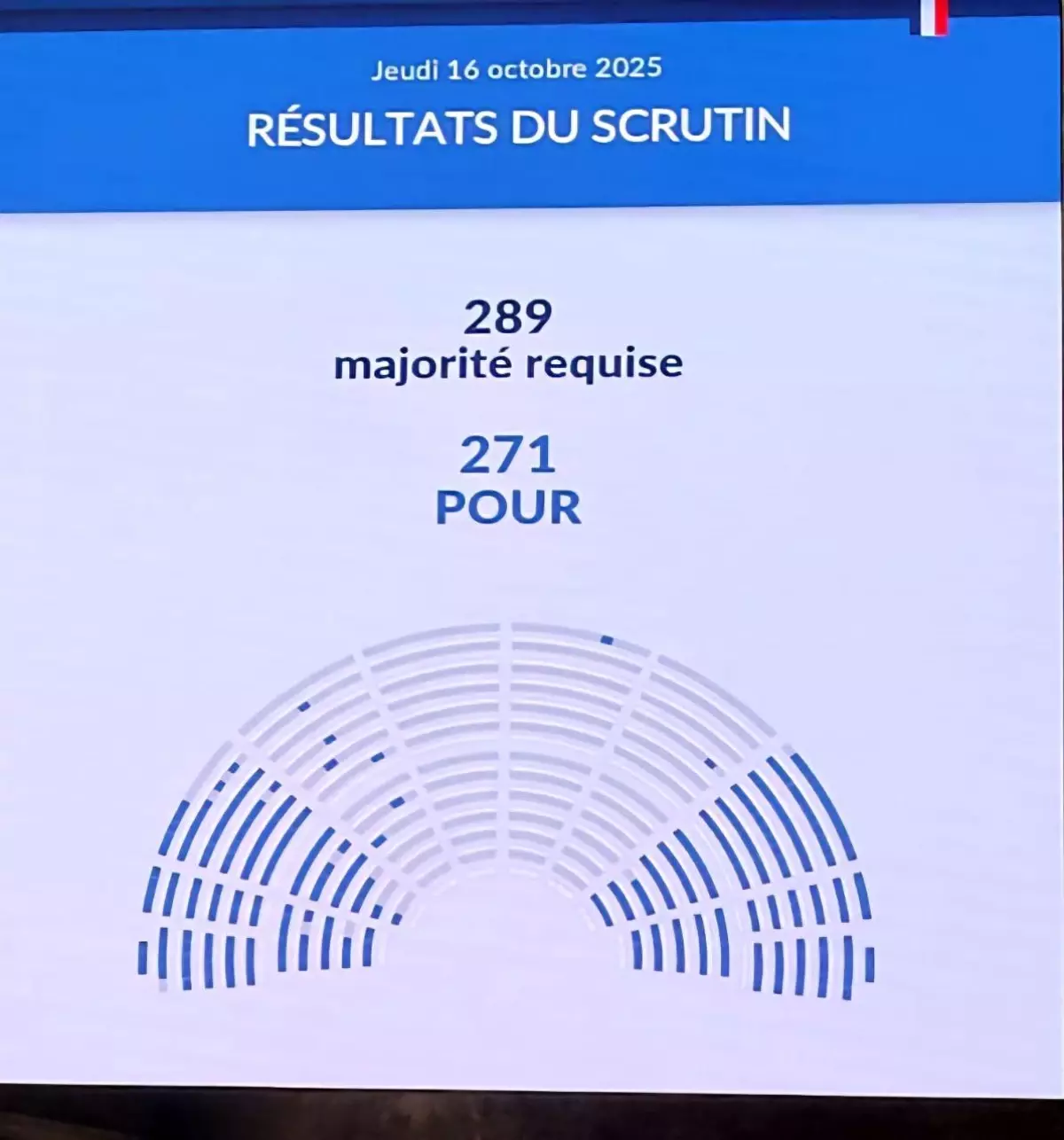 Fransa’da 577 sandalyeli Ulusal Meclis’te Başbakan Sebastien Lecornu ve hükümetine karşı yapılan güven oylamasında 271 milletvekilinin hükümet aleyhinde oy kullanması sonucu hükümetin devrilmesi için gerekli olan 289 oyun sağlanamaması sonucunda hükümet “kıl payı ” ile güven oylamasından geçti.