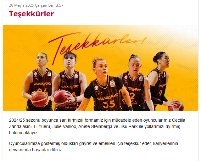 Sarı-kırmızılı kulüpten yapılan açıklamada, “2024-2025 sezonu boyunca sarı kırmızılı formamız için mücadele eden oyuncularımız Cecilia Zandalasini, Li Yueru, Julie Vanloo, Anete Steinberga ve Jisu Park ile yollarımızı ayırmış bulunmaktayız. Oyuncularımıza göstermiş oldukları gayret ve emekleri için teşekkür eder, kariyerlerinin devamında başarılar dileriz.” ifadelerine yer verildi.