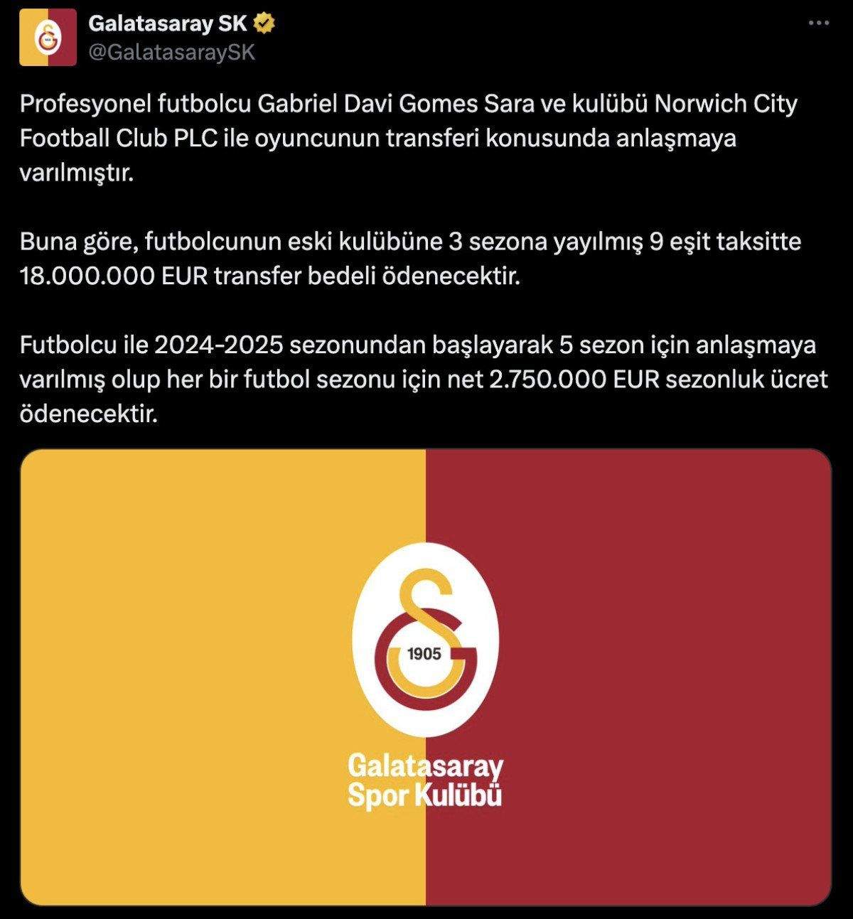 Norwich City formasıyla 96 maçta 21 gol ve 17 asistlik performans sergileyen Gabriel Sara, Galatasaray tarihinin en pahalı transferi olarak kayıtlara geçti.