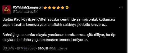 Galatasaray söz konusu saldırıyı kınayarak sosyal medya hesabından “Bugün Kadıköy ilçesi Çiftehavuzlar semtinde şampiyonluk kutlaması yapan taraftarlarımıza yapılan silahlı saldırıyı şiddetle kınıyoruz. Bahsi geçen menfur olayda yaralanan taraftarımıza şifa diliyor, bu tip olayların bir daha yaşanmamasını temenni ediyoruz.” açıklamasını yaptı.