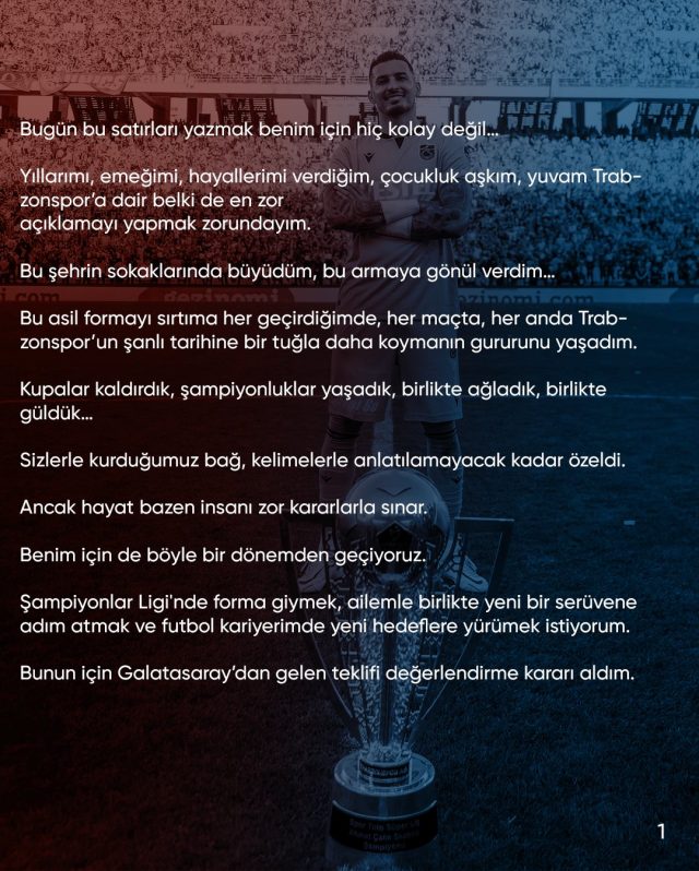 Trabzonspor’un milli kalecisi Uğurcan Çakır, Galatasaray’dan gelen teklifi değerlendirmeye aldığını sosyal medya hesabından açıkladı.