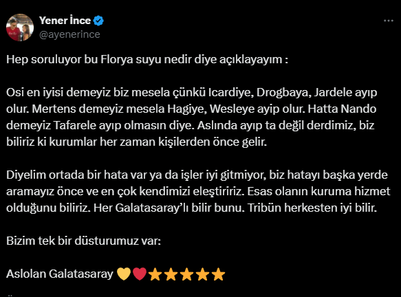 Esas olan Galatasaray’a hizmet olduğunu dile getiren Yener İnce paylaşımında şu ifadeleri kullandı: