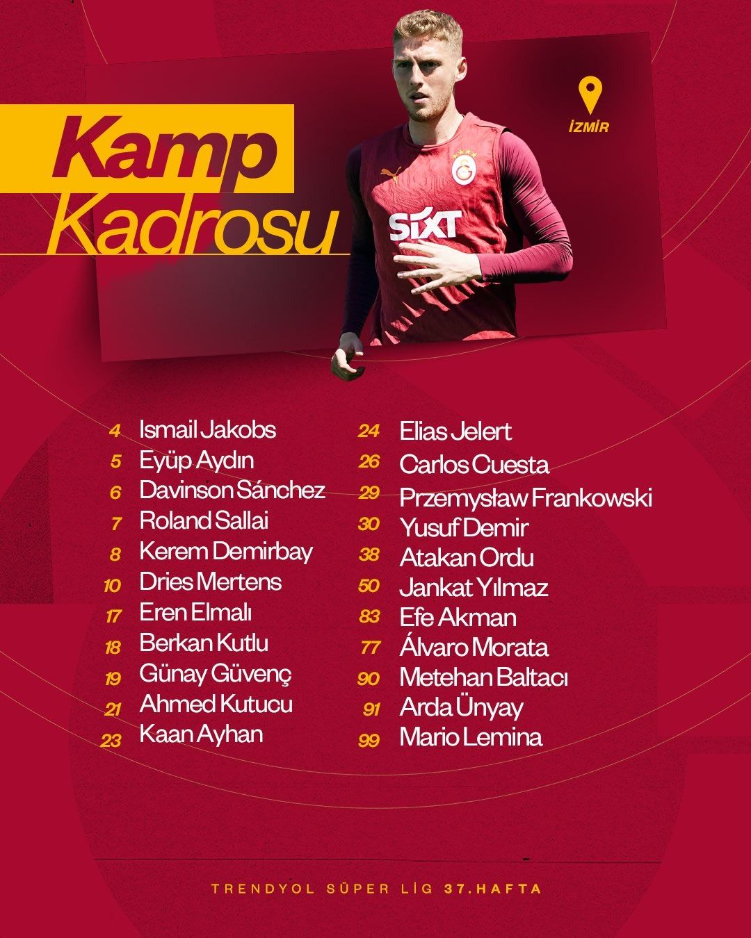 Karşılaşma öncesi İzmir’e hareket etmeye hazırlanan sarı-kırmızılıların kamp kadrosu açıklandı. Açıklanan kadroda Victor Osimhen, Fernando Muslera, Barış Alper Yılmaz, Abdülkerim Bardakçı, Lucas Torreira, Gabriel Sara ve Yunus Akgün’e yer verilmedi.