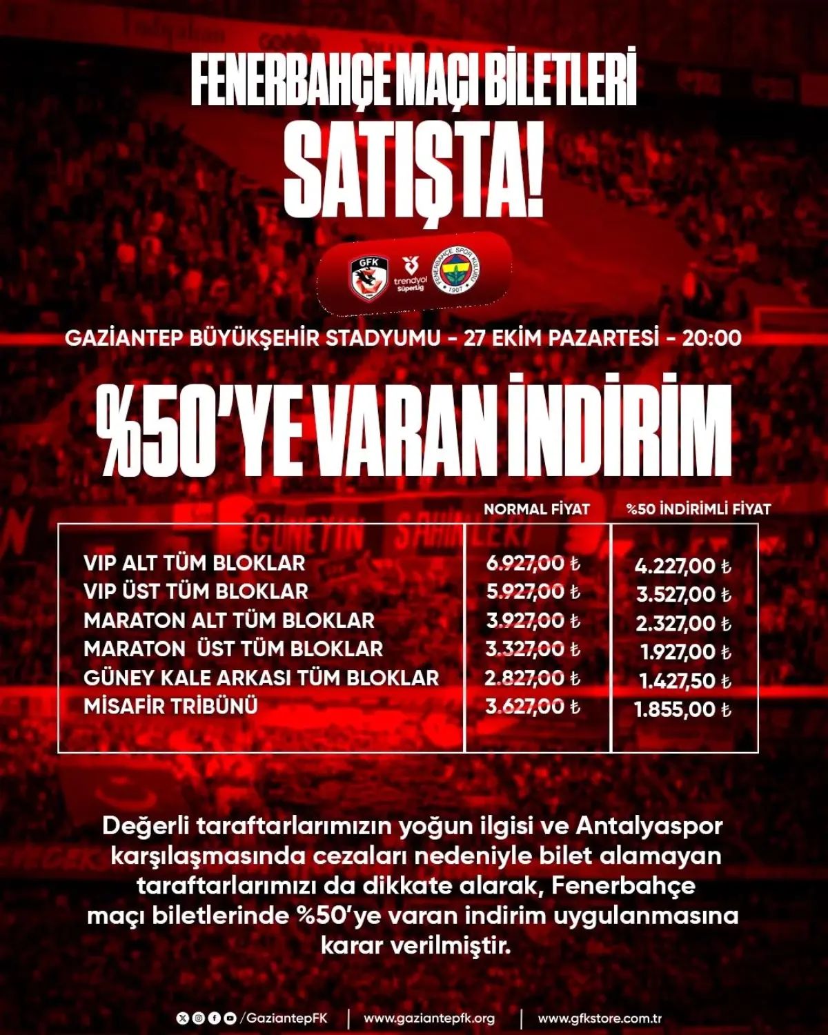 Konu ile ilgili Gaziantep ekibinden yapılan açıklamada, “Değerli taraftarlarımızın yoğun ilgisi ve Antalyaspor karşılaşmasında cezaları sebebiyle bilet alamayan taraftarlarımız da dikkate alınarak Fenerbahçe maçı biletlerinde yüzde 50’ye varan indirim uygulanmasına karar verilmiştir” ifadelerine yer verildi. – GAZİANTEP